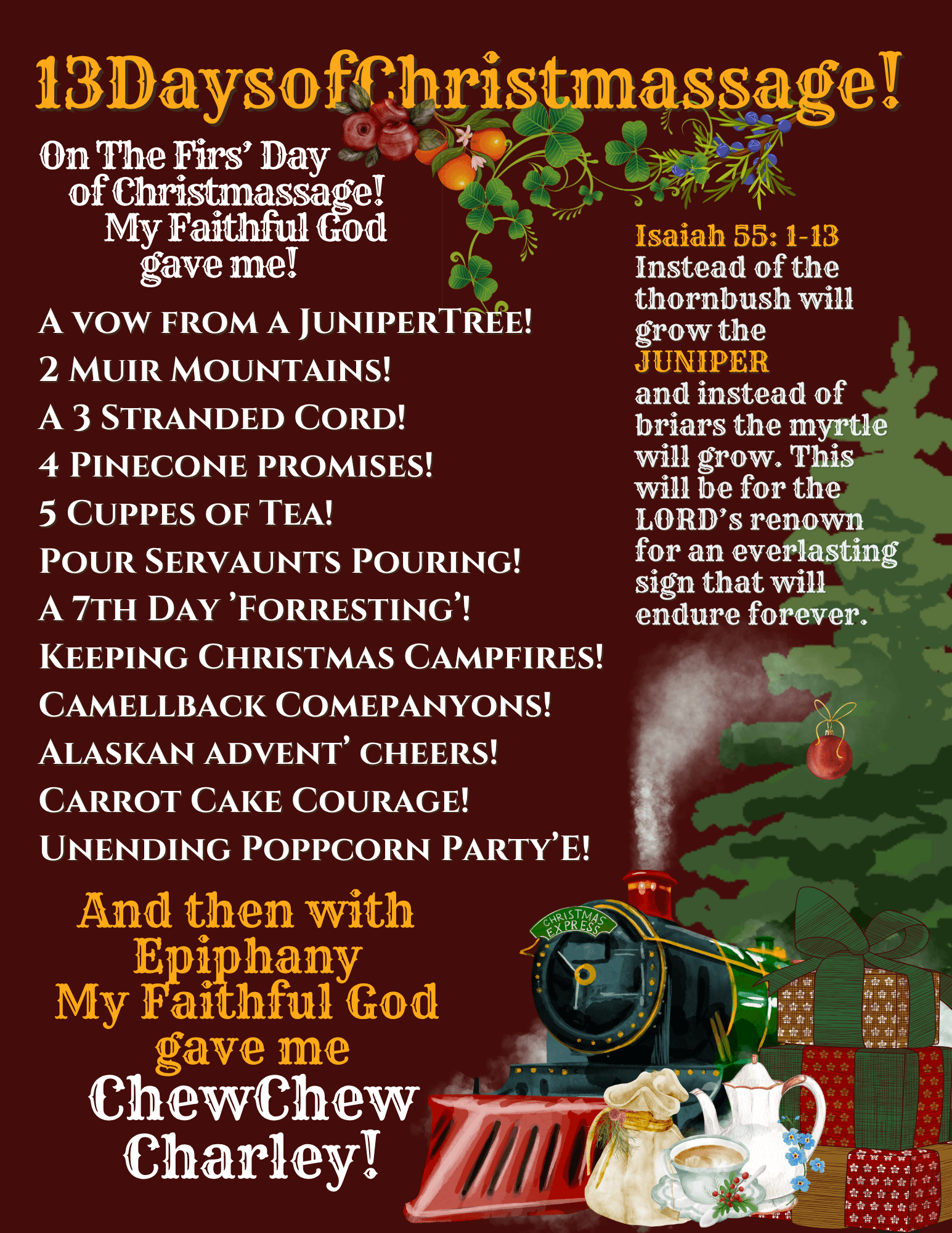 There are 10 "13 Days of Christmassage!" every year, running the 1st-13th of March and wrapping up the 1-13th of December! The 13 Days are patterned after The 12 Days of Christmas with Epiphany!
