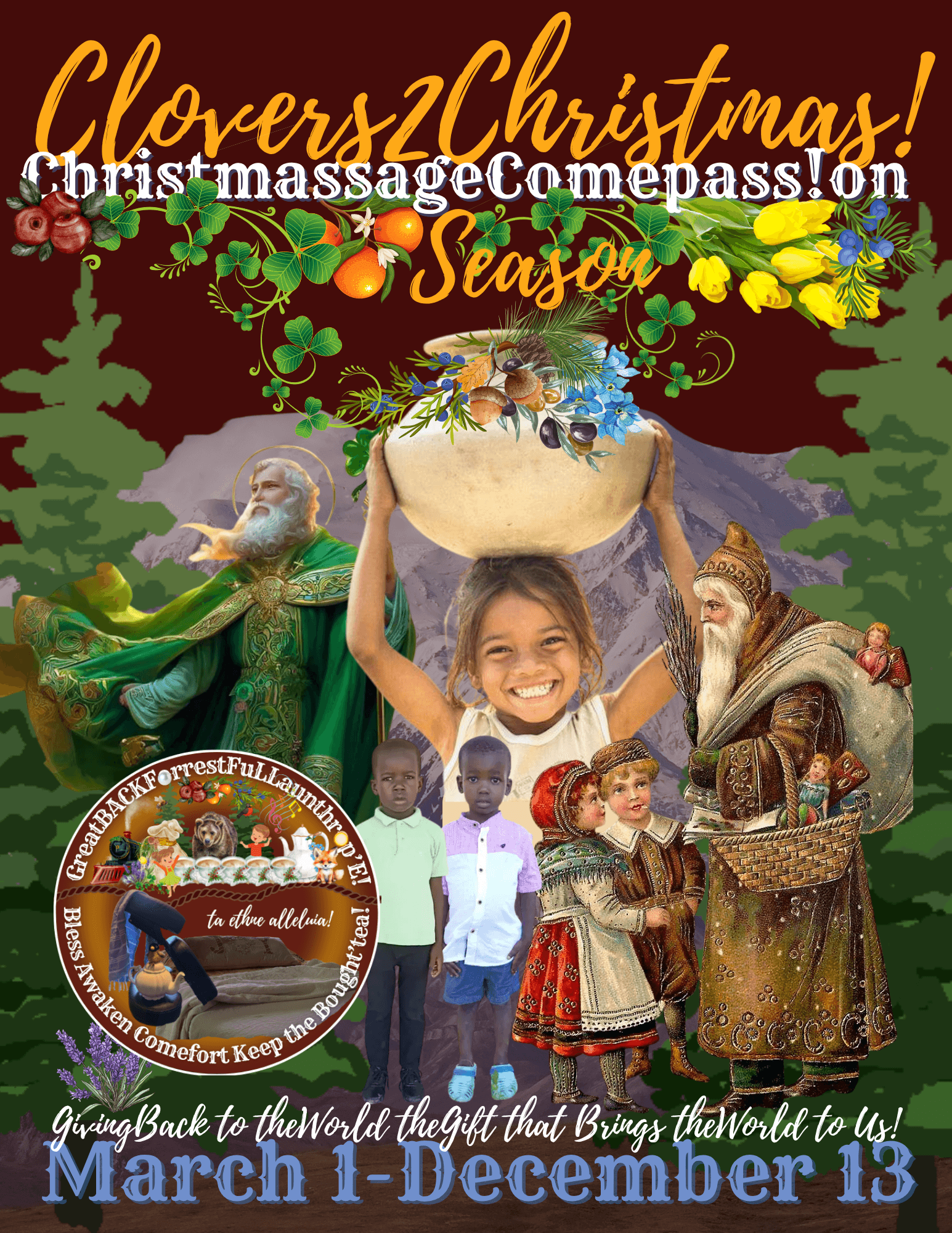 Clovers2Christmas! Christmassage Comepass!on Season runs from March 1st - December 13th every year! Clovers is named for the month of March. Saint Patrick was instrumental in sharing the gospel with the people of Ireland, and using the clover to explain the unity of the Father, Son and Holy Spirit.