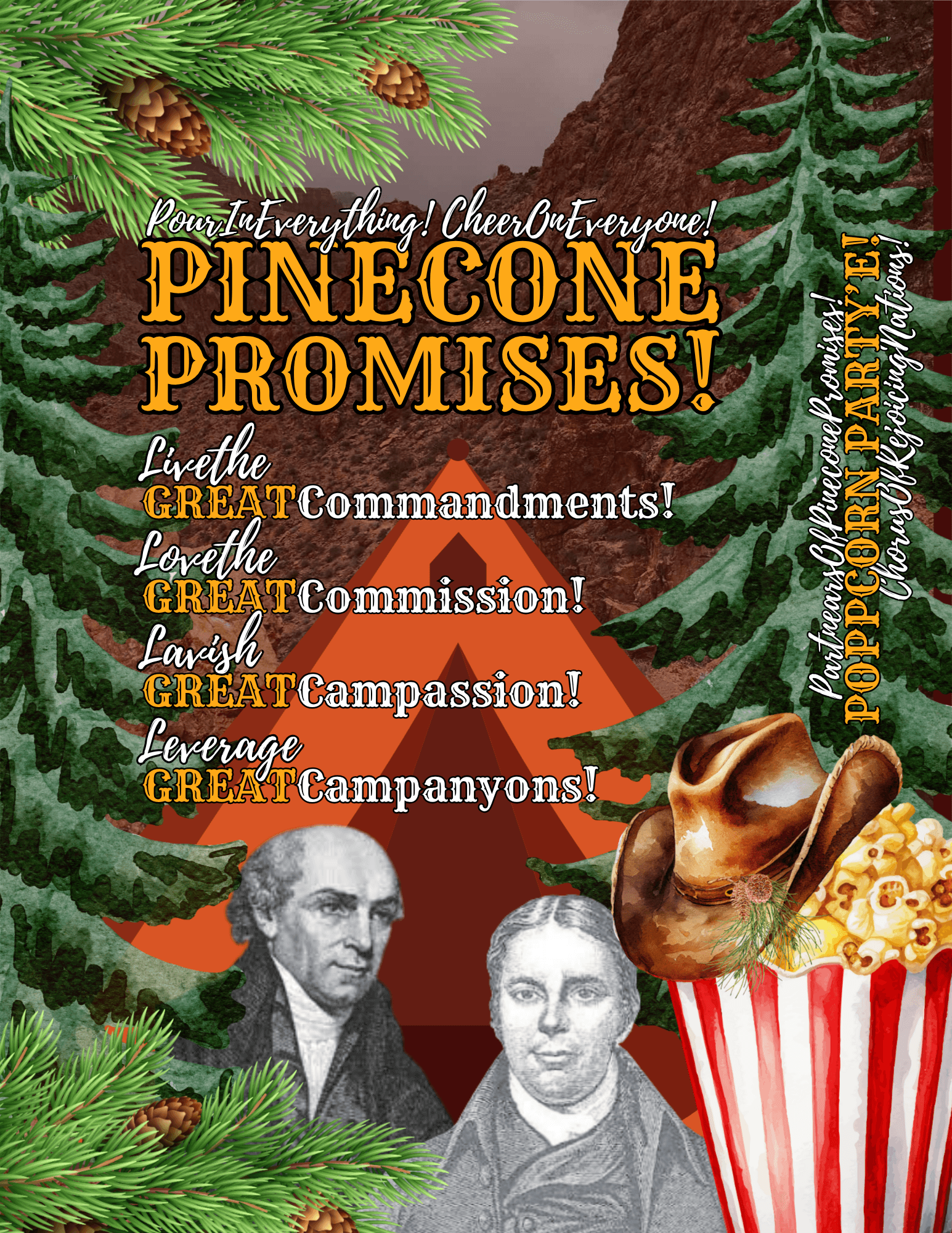 Poppcorn Party'E! needs some context to be understood. First, I will tell you that Poppcorn is an acronym for "Part'nears Of Pinecone Promises Chorus Of Rejoicing Nations" -and a little explanation with this. I chose to say Part'nears rather than Partners, to emphasize "joining in to do our part to bring the Kingdom of Heaven near". Pinecone Promises I will explain further down. Chorus Of Rejoicing Nations is the scene around the throne in Revelation---peoples from every tongue, tribe and nation, worshipping the Lamb of God! Party'E! is a group of people joined together on mission and it's a joyous celebration! The 'E! is for my Mother Evelyn! whose name means LIFE! and for Epiphany! which means revelation or manifestation and is the holiday that celebrates the wise magi coming to worship Jesus and to present him with gifts of gold, frankincense and myrrh. Epiphany signals the gospel going to the gentiles, to the nations! 'E! is for the Ends of the Earth!